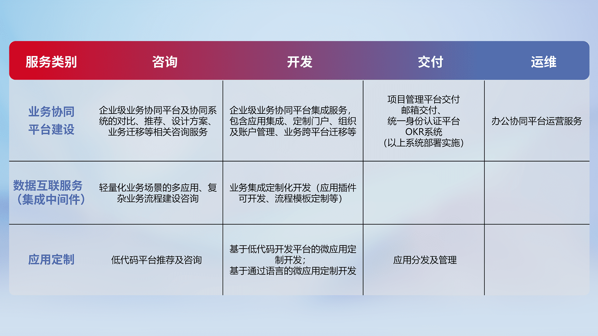 针对钉钉、、、企微、、、IDaas等平台级产品提供产品的规划、、方案、、、、交付、、定制化开发等服务,,,,实现如统一协同办公、、、智能客户服务、、、、混合会议管理、、、智能数据查询、、、、等业务场景,,,,实现数字化转型。。